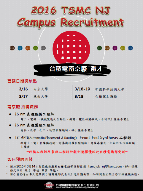 请有意愿的同学在3月14日之前投简历至总部邮箱:tsmcjob_nj@tsmc.com,邮件标题格式注明:姓名_学校_专业_学历。符合资格者由专人邀请与台积电总部代表面谈,时间地点见海报中的介绍,如时间无法配合亦可采视频面谈。设备工程师及制程工程师于报到后择优派赴台积电总部受训。